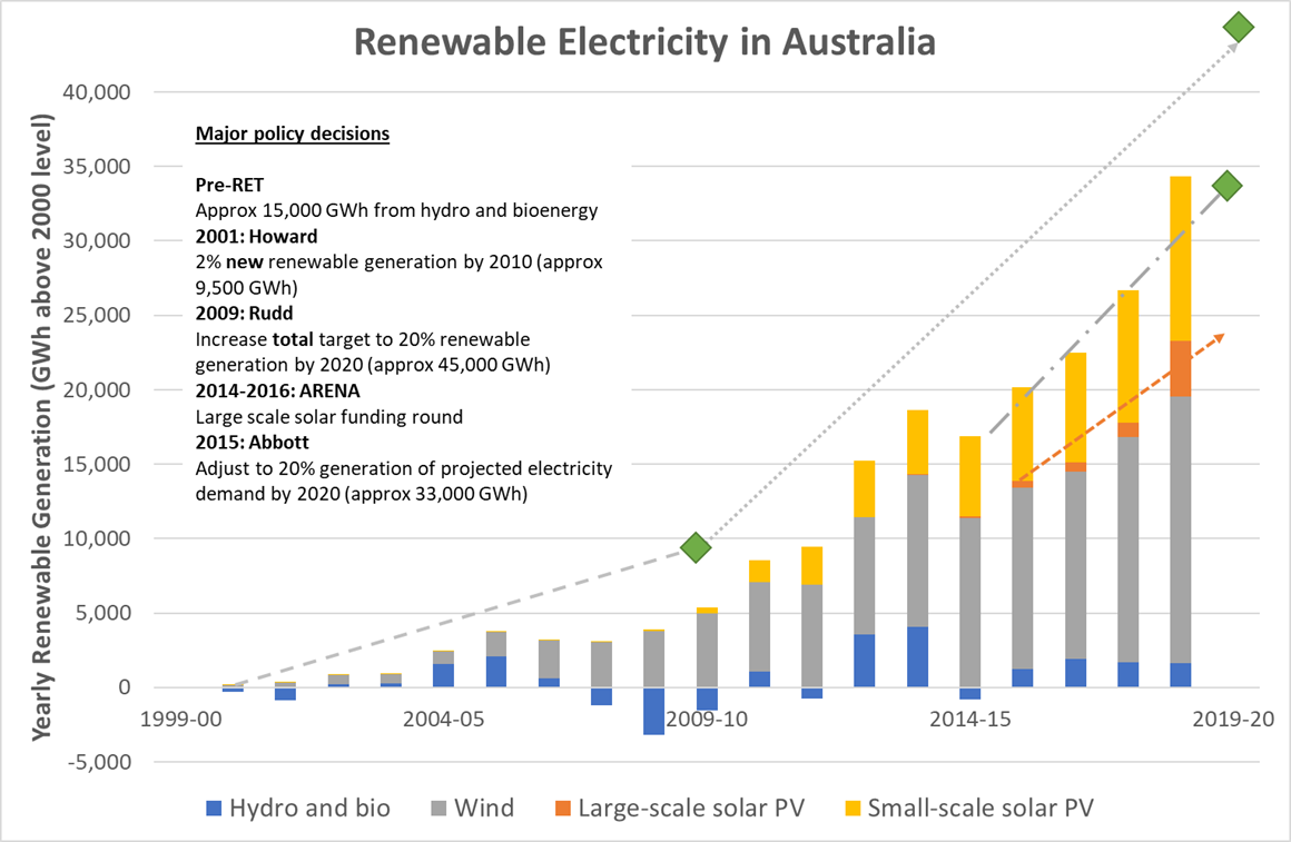 Figure 2: How the renewable energy target has driven renewable electricity generation (Source: Australian Energy Statistics, Energy Networks Australia analysis)