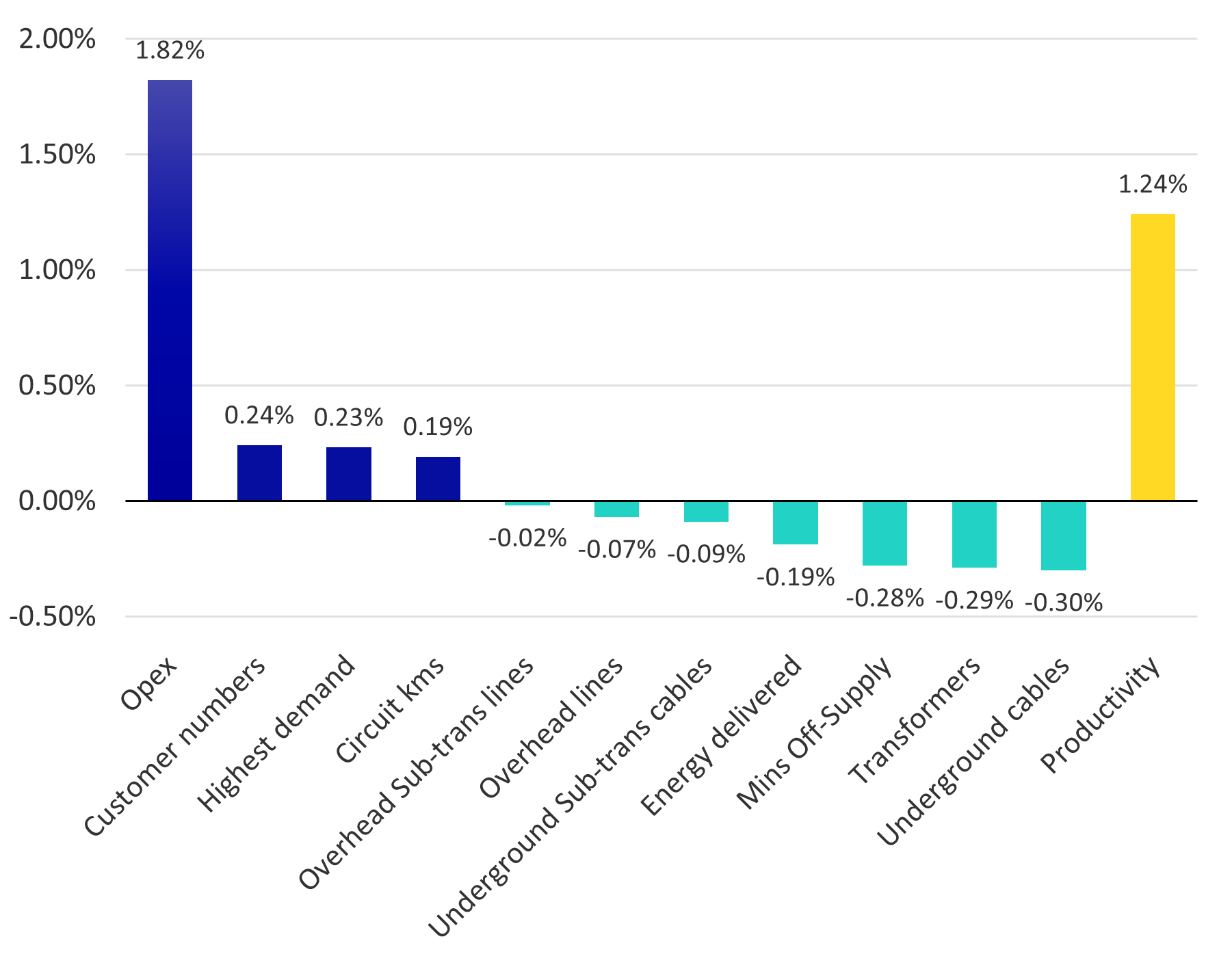 Transmission productivity improvements were led by higher reliability, recognised formally as lower unsupplied energy to customers. Smaller positive contributions to productivity were made by lower opex, fewer overhead lines and more customers.