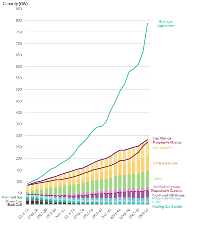The ISP is a portfolio of projects that are robust to a range of scenarios and tested against a least-regrets approach. The two main scenarios Step Change and Hydrogen Superpower lead to substantive increases in demand as parts of the economy electrify to reduce emissions, see Fig 2.