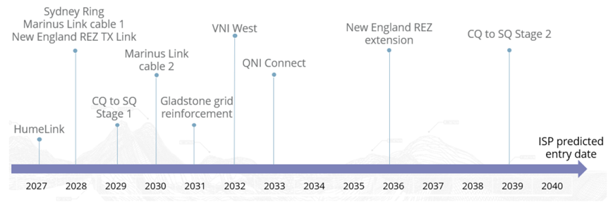 Modelling was conducted based on one, two, three and four-year delays to the commissioning of the projects that make up the optimal development path in the ISP. Figure 1 shows these transmission projects and their expected timing.
